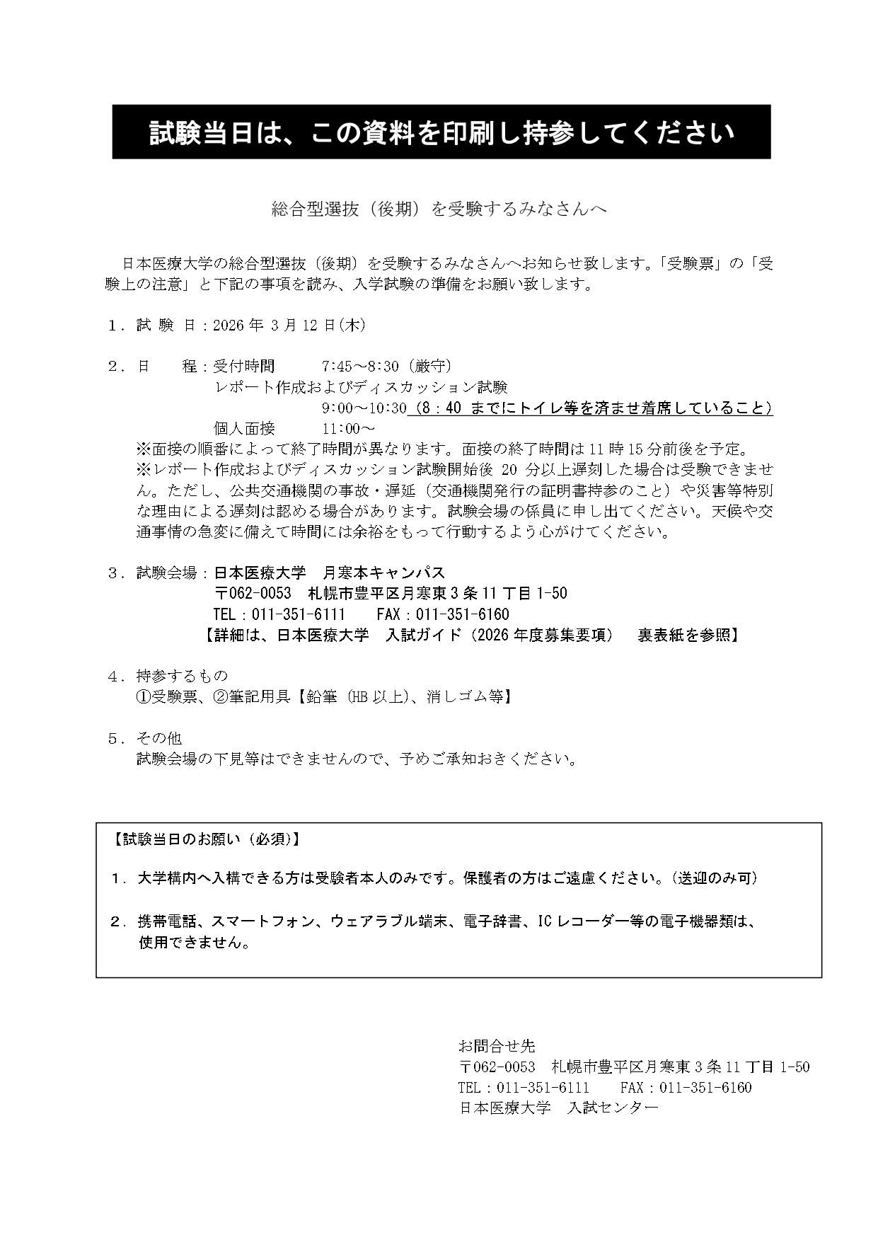 IMPORTANT 2026.03.06 【重要】総合型選抜(後期)を受験するみなさんへ 下記資料の内容をよく読み、入学試験の準備をお願いいたします。資料を印刷し、試験当日に持参をしてください。 総合型選抜(後期)試験当日のタイムスケジュールはこちらをご覧ください。 ◆問い合わせ先◆ 入試センター 《電話》011-351-6111
