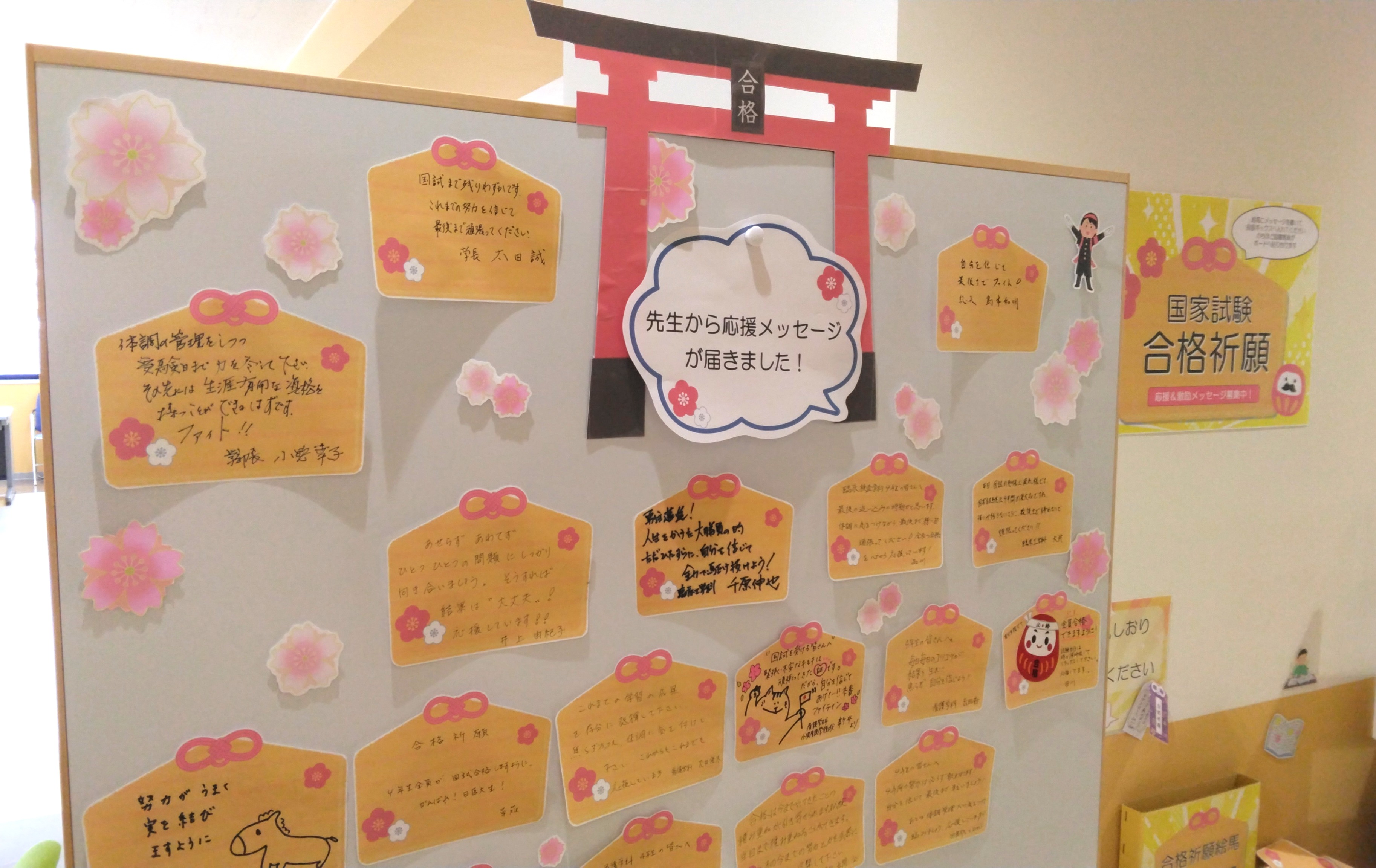 NEWS おしらせ 2026.01.28 【附属図書館】国試の応援展示を開始しました 各種国家試験が来月に迫る中、附属図書館(月寒キャンパス)では受験勉強を頑張る皆さんへ向けた国家試験の応援展示を開始しています。 各学科の先生から寄せられた応援メッセージのほか、合格祈願の御守り風しおりも配布中です。受験される皆さんが実力を発揮できるよう、教職員一同応援しています!