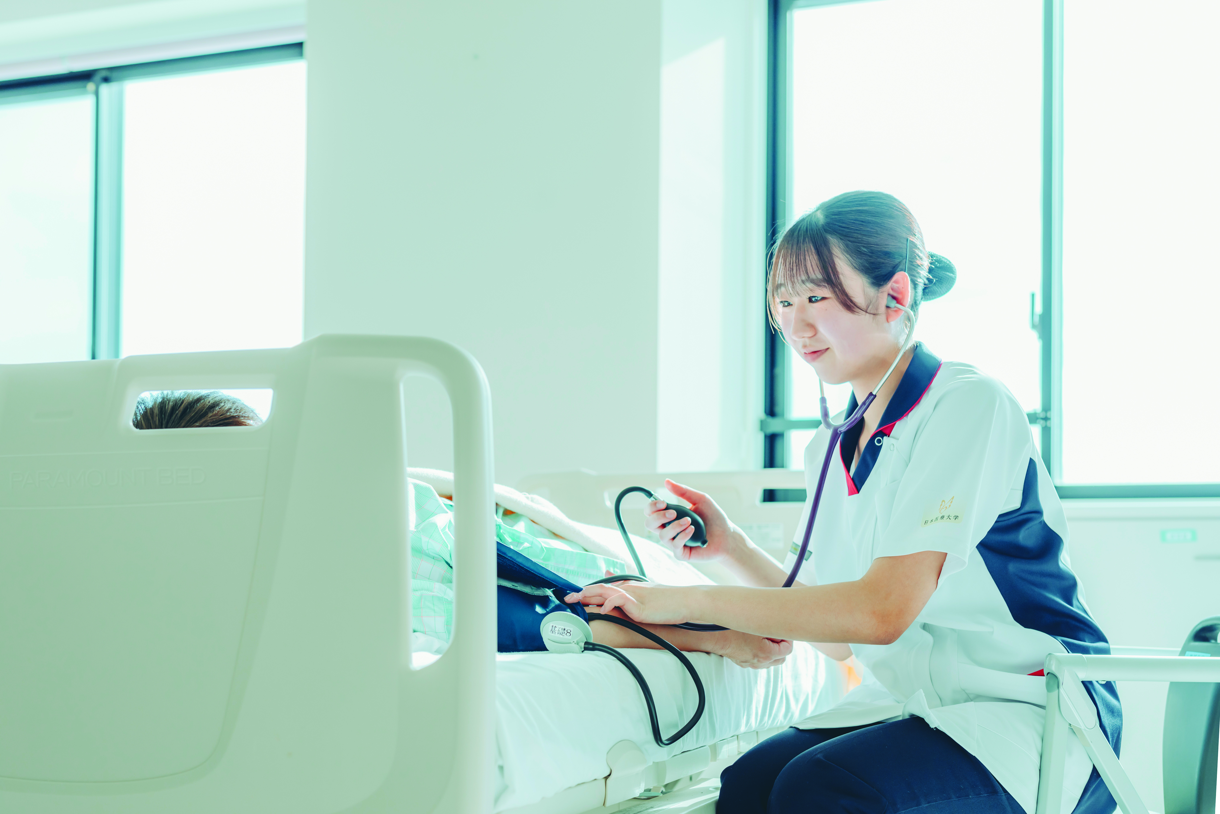本学は病院や福祉施設が隣接していて現場を身近に感じながら学べる上、学生サポートが充実していて、チャットアプリですぐに先生に質問できたり、事務局で日常生活の相談に乗っていただけるので、勉強に集中することができます。実習室などの施設設備も充実していて、バイタルサインや清拭などの自主練習もできるので、少しずつ看護師に近づいていく喜びを日々実感しています。